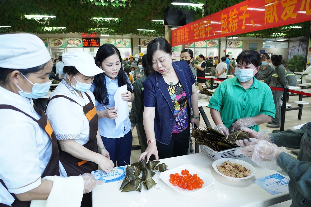 活动中,员工个个摩拳擦掌,跃跃欲试,有的员工拿出看家本领,经过折叶、盛料、压实、裹叶、扎绳等工序,迅速包成了一个个精巧美观的粽子,有的员工志在参与,一边学习包粽子,一边交流技巧经验,整个活动现场充满了欢声笑语,引来不少用餐的员工驻足观看。