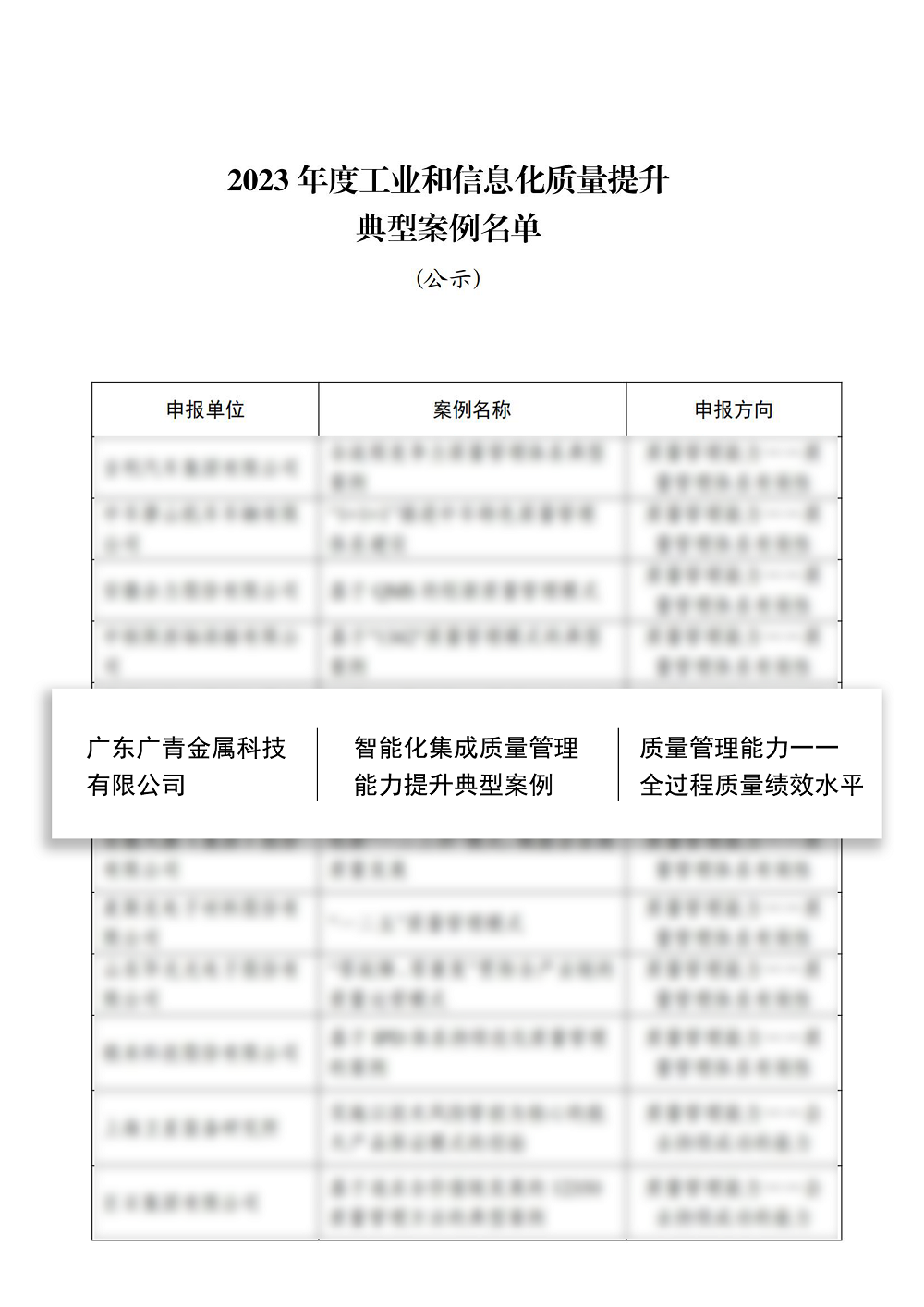 近日,国家工业和信息化部公布2023年度工业和信息化质量提升典型案例名单,广东广青金属科技有限公司《智能化集成质量管理能力提升典型案例》成功入选。