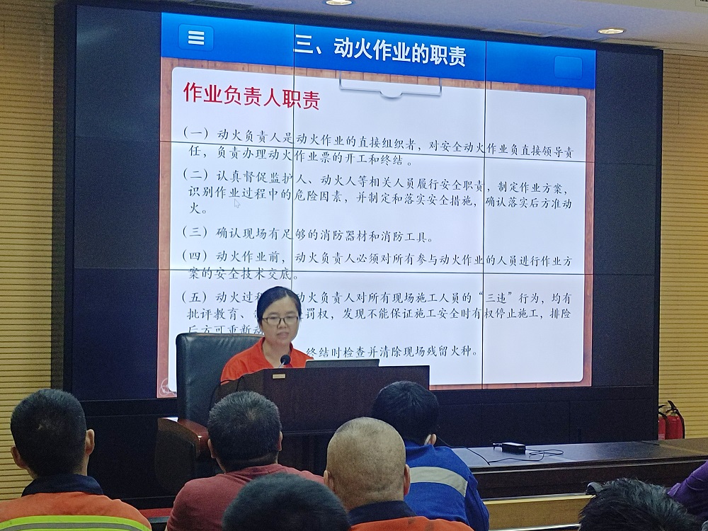 安环部部长王新教对参训人员作出了要求:所有动火作业必须严格执行作业审批制度,严格作业票的审批过程,各级审批人员必须将安全措施落到实处;动火作业结束后现场安全确认至关重要,监护人、作业人必须确认作业部位火种是否消除,做到“三清退场”;培训课程的事故案例非常典型,参训人员一定要汲取事故教训,杜绝类似事故的发生,确保动火作业安全。