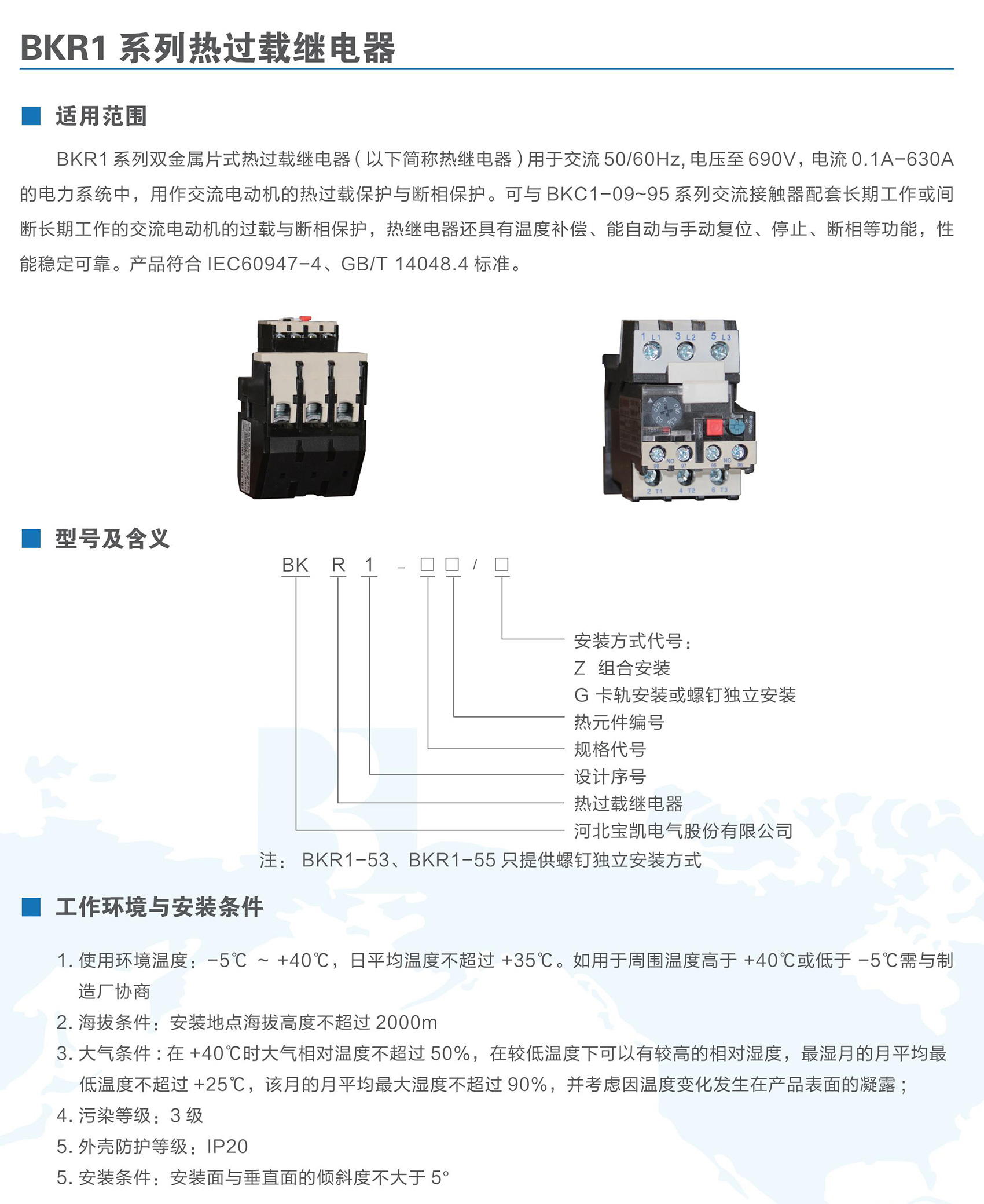 BKR1系列热过载继电器,在交流50Hz(60Hz)、额定电压至690V、电流0.1A至630A的电路中,作三相交流电动机的过载和断相保护之用。热过载继电器具有温度补偿、动作指示、自动和手动复位、停止等功能,性能稳定可靠。产品符合IEC 60947-4、GB/T 14048.4、GB/T 14048.5标准。